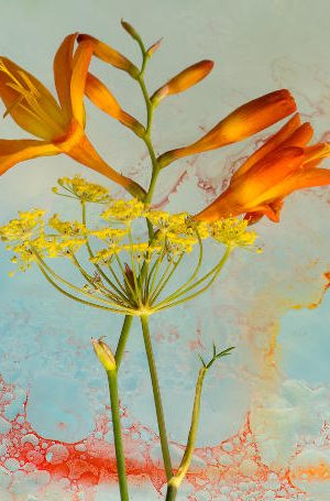 Marie Phelan was born in County Galway, has lived in the UK and now lives in County Wexford. She combines photography with painted backgrounds that draw out and enhance the characteristics of her home-grown flowers and plants. She has an Associate distinction from the Irish Photographic Federation, is a member of Wexford Camera Club and exhibits regularly in Wexford, for example during the opera festival and at the Wexford Arts Centre cafe. As an enthusiastic gardener she has her pick of subject material, and with an eye to future images, grows unusual and colourful plant varieties. Her painted backgrounds are achieved using watercolour and mixed media. While a background is ‘oozing and in a state of flux’, she judges the moment to place her flower or plant, and captures it with a macro lens.
