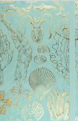 - Striking journal design is made up of delicately depicted aquatic motifs — sea ferns, sea shells, jellyfish, and more — outlined and embellished with gold foil.